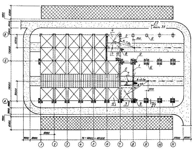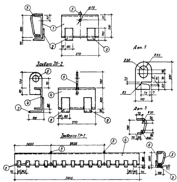 1 - стойка рамы; 2 - балка рамы; 3 - рама каркаса; 4 - подкрановая балка; 5 - цокольная стеновая панель; 6 - трехслойная стеновая панель; 7 - кровельная панель ПКМ-120; 8 - картина покрытия; 9 - полурама каркаса; 10 - строп СКП1-2,5/10200; 11 - строп 4СК1-3,2/5000; 12 - строп СКП1-3,2/7160; 13 - строп СКП1-1,1/8000; 14 - строп СКП1-1,1/9000; 15 - строп СКП1-0,32/1500; 16 - пружинный замок ПР-3,2; 17 - захват КР-3,2; 18 - траверса ТР-1; 19 - захват ЗХ-1; 20 - захват ЗХ-2; 21 - скоба такелажная, типоразмер 1.7; 22 - болт М16; 23 - инвентарные стальные подкладки под канат; 24 - подкладки из круглого леса Æ 160 мм, l = 1000 мм; 25 - канат для дистанционной расстроповки; 26 - расчалки РЧ-1, РЧ-2; 27 - пакет панелей ПКМ-120 1. Данный лист рассматривать совместно с л. 30, 31. 2. Конструкция захватов ЗХ-1, ЗХ-2 и траверсы Тр-1 дана на л. 33. Захват ЗХ-1