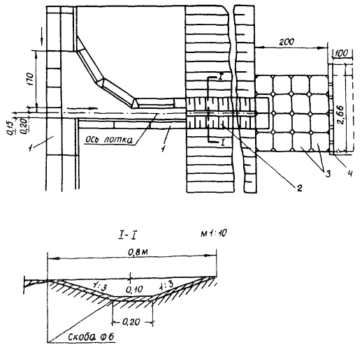 где Q - расход воды, см3; t - время истечения, с; J - градиент фильтрации; F - площадь, сечения образца с учетом уплотнения, см2; Т - температурная поправка, принимаемая в соответствии с методикой испытания грунтов. Истираемость определяется количеством циклов движения сетки с песчаным абразивом до образования дыры. Коэффициент трения по грунту оценивается в процентах по отношению к тангенсу угла внутреннего трения грунта и определяется в приборах плоского среза путем вытягивания через зазор прибора образца полотна при расчетных нормальных нагрузках. Приложение 1Методика гидравлического расчета лотковой конструкции защиты откосовМетодика расчета предусматривает: установление исходных данных, назначение расстояния между поперечными лотками ℓ, определение максимального дождевого расхода QР расчетной вероятности превышения при заданном ℓ, подбор под величину QР ширины в трапецеидального поперечного лотка. К исходным данным относятся: ливневой район, категория дороги, продольный уклон участка дороги, поперечный профиль дороги. Расстояние между поперечными лотками назначают по п. 2.8. Максимальный дождевой расход QР расчетной вероятности превышения определяют по формуле QР = 16,7αРFφКу, (1) где αР, φ, Ку - параметры, устанавливаемые по «Методическим рекомендациям по расчету максимального дождевого стока и его регулированию» (Союздорпроект. М., 1980); F - водосборная площадь, км2. Расчетная вероятность превышения для дорог I - II категорий - 1 %, III - 2 %, IV - V - 3 %. Площадь водосбора F находят по формуле F = ВРℓ, (2) где ВР - ширина водосбора (расстояние от водораздельной точки на поперечном профиле дороги до оси продольного лотка), км; ℓ - расстояние между поперечными лотками, км. При указанных в п. 2.8 расстояниях водопропускная способность продольных лотков достаточна для беспрепятственного отвода воды в поперечные лотки во всех случаях проектирования. Поэтому дальнейший расчет заключается в определении по величине QР при заданном значении ℓ минимальной ширины в по дну поперечного водосбросного лотка: где hK - критическая глубина потока в поперечном лотке; принимается по аналогии с типовым телескопическим откосным лотком равной 0,12 м; q - ускорение свободного падения; q = 9,81 м/с2; α - коэффициент кинетической энергии; α = 1,1. Полученное по формуле (3) значение в округляют в большую сторону до величины, кратной 0,1 м. Пример расчета. Автомобильная дорога III категории проектируется в 6-м ливневом районе. Продольный уклон участка дороги J = 40 ‰. Поперечный профиль с двухсторонним уклоном проезжей части, заложение откосов насыпи и про дольного лотка 1:2, превышение бровки насыпи над бровкой продольного лотка 0,5 м, глубина лотка 0,25 м. По этим данным ВР = 3,5 + 2,5 + 0,75 - 2 = 7,5 м. Расстояние между поперечными лотками назначаем по п. 2.8. ℓ= 0,75 м. Используя «Методические рекомендации по расчету максимального дождевого стока и его регулированию» (Союздорпроект. М., 1980), находим для 6-го ливневого района при вероятности превышения 2 %, J = 40 ‰ и F = ВРℓ = 0,000625 км2 значения коэффициентов: αР = 2,92 мм/мин; φ = 0,935; Ку = 1,65. Рассчитываем QР = 16,7·2,82·0,000625·0,935·1,65 = 0,047 м3/с;