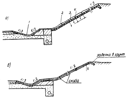 где ρГ - плотность грунта, кН/м3; hГ - глубина заложения прослойки от поверхности насыпи, м. Расчет длины защемленного участка следует проводить для частей прослойки, расположенных по обеим сторонам от расчетной поверхности скольжения. При назначении нескольких прослоек по условию армирования насыпи их целесообразно располагать, начиная с нижней части насыпи, с интервалом по высоте 1 - 2 м. При устройстве армирующих прослоек должны быть обеспечены сплошность и равнопрочность полотна в пределах защемленной полосы. Укладка внахлест и наличие ослабленных стыков недопустимы. 3. Геотекстильные полотна в укреплениях подтопляемых откосов3.1. В укреплениях подтопляемых откосов геотекстильные полотна укладывают в комплексе с обычно применяемыми конструктивными элементами, воспринимающими гидродинамические воздействия на поверхностную зону откоса и одновременно фиксирующими текстильное полотно на поверхности откоса. Геотекстильная прослойка устраивается в дополнение к обычной конструкции укрепления с целью повысить ее надежность или взамен какого-либо из слагающих укрепление элементов для снижения материалоемкости конструкции. В большинстве случаев геотекстильное полотно в укреплении подтопляемой насыпи выполняет функцию обратного фильтра, препятствующего выносу водным потоком грунтовых частиц из тела насыпи, или служит ограждением, обеспечивающим устойчивое положение грунтового откоса при силовом воздействии воды или при снижении прочности грунта в процессе подтопления и увлажнения. Одновременно с этими основными функциями геотекстильная прослойка в отдельных случаях играет роль армирующего элемента и противоэрозионного покрытия. Использование геотекстильных полотен в качестве внешних элементов укрепления (покрытия, ограждения) допускается только на участках сезонного подтопления, при отсутствии ледяного покрова на акватории в период подтопления и при необходимости защиты поверхности геотекстильного полотна от светового облучения. 3.2. Укрепление подтопляемого откоса может быть выполнено в виде сплошного геотекстильного покрытия, аналогичного указанному в п. 2.3, в комбинации с плакировкой растительным грунтом и посевом трав под покрытие, обработкой поверхности полотна органическим вяжущим и закреплением полотна на поверхности откоса ивовыми кольями с их последующим прорастанием. Это наиболее легкий вид укрепления, устраивается на участках временного подтопления взамен сплошной одерновки или фашинной выстилки. Геотекстильное полотно на незаросшем откосе в период строительства и в первые годы эксплуатации дороги выполняет роль ограждения и защитного покрытия, а в дальнейшем (после сформирования травяного покрова) армирует дернину, обеспечивая местную устойчивость откоса. Уклон откоса принимается в зависимости от вида слагающего насыпь грунта в тех же пределах, что и для неподтопляемого откоса, при условии, что общая устойчивость откоса для условий подтопления независимо от применения геотекстильного покрытия обеспечена. 3.3. Для укрепления подтопляемых откосов насыпей из песчаных грунтов на участках как временного, так и постоянного подтопления геотекстильная прослойка может быть использована в качестве обратного фильтра (рис. 8). Назначение геотекстильного фильтра - упростить конструк