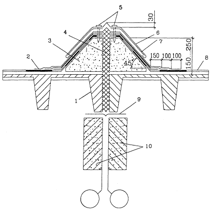 Рисунок 4 - Ремонт мест примыканий к углам аэрационных фонарей Рисунок 5 - Ремонт кровельного ковра в деформационных швах 1 - плита перекрытия; 2 - три дополнительных слоя «Изоэласта»; 3 - бортовой камень из бетона; 4 - минераловатная плита; 5 - дюбели с шагом 600 мм; 6, 9 - верхний и нижний компенсаторы из оцинкованной стали; 7 - полоса из стали 400´40´4 через 600 мм; 8 - основной кровельный ковер; 10 - внутренние стеновые панели. Применение машины ЛНИИ АКХ позволяет разрезать рулонный ковер с помощью вращающейся фрезы на требуемую глубину. Машина используется на крышах зданий с уклоном до 15 %. Перемещение машины осуществляется вручную. Зона обслуживания машиной ЛНИИ АКХ и размеры захваток определяются длиной электрических кабелей и конструктивными размерами зданий. Машина ЛНИИ АКХ работает следующим образом: - устанавливают требуемую глубину врезания фрезы, определяемую толщиной рулонного покрытия и включают электродвигатель; - фрезу плавно опускают до касания с поверхностью рулонного ковра и начинают равномерно двигать вперед, обеспечивая требуемую глубину нарезки шва. При перемещении машины на новое место необходимо предварительно вывести фрезу из материала кровли. 2.13 После нарезания швов рулонного ковра кромки торцов образовавшихся полос надрезают вручную с помощью инвентарного скребка, скатывают в рулоны и удаляют с крыши. Затем основание кровли очищают скребком от остатков мастики. 2.14 После снятия старого рулонного ковра основание кровли должно быть высушено. Для этой цели используют специальную машину марки СО-107 для сушки основания кровли. Использование этой машины согласно техническим данным, приведенным в таблице 3, обеспечивает высокое качество подготовки поверхности основания под устройство кровли. Таблица 3 - Технические характеристики передвижной машины для сушки основания кровли СО-107