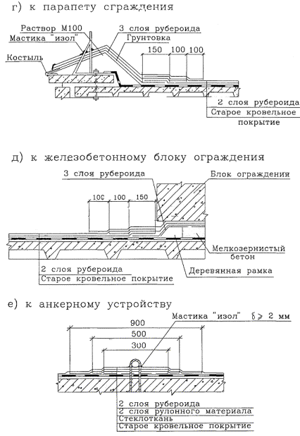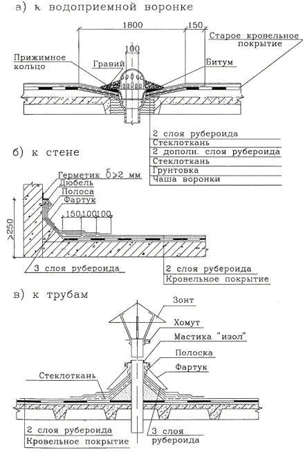 ДВУХСЛОЙНОГО РУЛОННОГО 7352ТК Главный инженер ____________ А.В. Колобов 2000 Технологическая карта на устройство двухслойного рулонного ковра кровли по предварительно отремонтированному существующему кровельному покрытию содержит решения по организации и производству кровельных работ с целью обеспечения их качества, соблюдения техники безопасности и охраны труда. В технологической карте приведены: - область применения; - организация и технология строительного производства; - требования к качеству и приемке работ; - требования техники безопасности и охраны труда, экологической и пожарной безопасности; - потребность в материально-технических ресурсах; - технико-экономические показатели. Технологическая карта предназначена для производителей работ, мастеров и бригадиров, занимающихся ремонтом кровельных покрытий, технического надзора заказчика, а также инженерно-технических работников строительных и проектных организаций. Технологическую карту разработали: Бычковский Б.И. - руководитель работы; Покровская Е.В., Савина О.А., Воинова Е.А. - исполнители; Ярымов Ю.А. - нормоконтроль; к.т.н. Шахпаронов В.В. - научно-методическое руководство; к.т.н. Едличка С.Ю. - общее руководство. Технологическая карта не заменяет ППР. (см. СНиП 3.01.01-85*) СОДЕРЖАНИЕ 1 Область применения1.1 Технологическая карта на устройство двухслойного рулонного ковра по существующему кровельному покрытию разработана для использования при капитальном ремонте кровель жилых и общественных зданий. 1.2 Подача материалов на крышу предусмотрена с помощью крана, который подбирается в зависимости от высоты здания, а мастик - автогудронатором ДС-39А, Б. 1.3 При привязке технологической карты к конкретному объекту уточняются объемы работ, материально-технические ресурсы, калькуляция, график производства работ. 2 Организация и технология строительного производства2.1 До начала работ по устройству двухслойного рулонного ковра по отремонтированному старому должны быть определены места и размеры дефектов, подлежащих устранению в существующем кровельном покрытии: - разрушения кровельного покрытия в местах застоя воды с накопившимся в них слоем грязи; - вздутия в покрытии; - отслаивания покрытий; - разрывы покрытия над стыками между панелями; - сползания рулонного материала с образованием складок и разрывов; - смывания защитных посыпок и выветривание; - отслоения, сползания и другие нарушения сплошности кровельного покрытия в местах примыкания к конструкциям здания (стенам лифтовых и вентиляционных шахт, парапетам, трубам, стоякам и т.п.); - нарушения сплошности кровельного покрытия в месте примыкания его к водоприемной воронке; - нарушения сплошности кровельного покрытия в местах крепления анкерных петель для оттяжек электростоек и радиоантенн; - отсутствие металлических фартуков, хомутов и других элементов; - механические повреждения покрытия ломами и лопатами. 2.2 До начала ремонта старого кровельного покрытия должны быть выполнены следующие работы: - установлено ограждение опасной зоны на земле по периметру здания в соответствии со СНиП III-4-80* и СНиП 12-03-2001, а в местах прохода людей устроены защитные сплошные настилы; - установлено временное ограждение на крыше (на период ремонтных работ) в случае разборки парапетных камней и ограждения; - снабжены звенья кровельщиков комплектом 