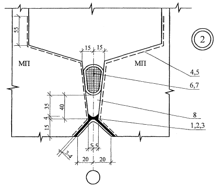 Рисунок 11 - Укладка уплотняющей прокладки в стык (рисунки 2, 3 - поз. 6, 7) М1 и М2 с помощью деревянной конопатки вводят «насухо» уплотняющую прокладку в паз шва. Заглубляют его, не допуская растягивания, следят за тем, чтобы уплотняющая прокладка в стыках была обжата на 30 - 50 %. В местах соединения в прокладках вырезается паз и стык шнуров склеивают.