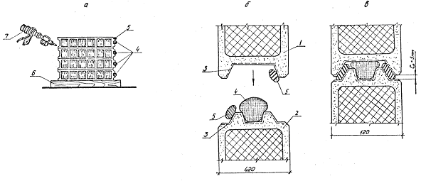а - нанесение валиков мастичного герметика на выступы паза и гребня панели перед ее монтажом с помощью электрогерметизатора; б - подача панели с помощью крана к месту ее установки в здании; в - установка панели в проектное положение. При этом происходит обжатие валиков мастичного герметика под действием собственного веса панели 1 - монтируемая панель; 2 - ранее смонтированная панель; 3 - грунтовочный слой; 4 - упругая прокладка; 5 - валики мастичного герметика типа НГМС; 6 - деревянная подкладка; 7 - электрогерметизатор Таблица 2