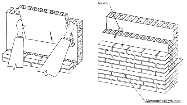Рисунок 9 - Приемы труда 2.29 При производстве работ в зимних условиях следует руководствоваться следующими указаниями: 2.29.1 Кладку облицовочного кирпича рекомендуется выполнять на цементных, цементно-известковых и цементно-глинистых растворах. Состав строительного раствора заданной марки для зимних работ, подвижность и сроки сохранения подвижности устанавливает проектная организация и контролирует предварительно строительная лаборатория. Возведение облицовки следует выполнять равномерно по всей захватке, не допуская разрывов по высоте более чем на 1/2 этажа. При кладке глухих участков и углов разрывы допускаются высотой не более 1/2 этажа и выполняются штрабой. Не допускается при перерывах в работе укладывать раствор на верхний ряд кладки. Для предохранения от обледенения и заноса снегом на время перерыва в работе верх кладки следует накрывать. 2.29.2 Кладку облицовки из кирпича в зимних условиях допускается возводить: - с противоморозными добавками на растворах не ниже марки М50; - на обыкновенных (без противоморозных добавок) растворах с последующим своевременным упрочнением кладки прогревом; - способом замораживания на обыкновенных (без противоморозных добавок) растворах не ниже марки М100 при условии обеспечения достаточной несущей способности конструкций в период оттаивания (при нулевой прочности раствора). 2.29.3 Применение растворов с противоморозными добавками должно быть согласовано с проектной организацией. Кладку на растворах с химическими добавками ведут на открытом воздухе так же, как и кладку способом замораживания на обычных подогретых растворах, но с обязательным соблюдением требований специальных инструкций. Растворная смесь с химическими добавками в момент укладки должна иметь температуру не ниже 5 °С. Замерзший, а затем отогретый горячей водой раствор использовать запрещается. 2.29.4 Кладку способом прогрева конструкций необходимо выполнять с соблюдением следующих требований: - утепленная часть сооружения должна оборудоваться вентиляцией, обеспечивающей относительную влажность воздуха в период прогрева не более 70 %; - нагружение прогретой кладки допускается только после контрольных испытаний и установления требуемой прочности раствора отогретой кладки; Глубина оттаивания кладки, продолжительность оттаивания, прочность растворов, твердеющих при различных температурах, принимается в соответствии со СНиП 3.03.01-87 «Несущие и ограждающие конструкции». 2.29.5 При кладке способом замораживания растворов (без противоморозных добавок) необходимо соблюдать следующие требования: - выполнять работы следует одновременно по всей захватке; - во избежание замерзания раствора его следует укладывать не более чем на два смежных кирпича при выполнении версты; - на рабочем месте каменщика допускается запас раствора не более чем на 30 - 40 мин. Ящик для раствора необходимо утеплять или подогревать. Использование замерзшего или отогретого горячей водой раствора не допускается. При устройстве кладки способом замораживания следует учитывать величину осадки кладки во время оттепели. Температура раствора в момент его укладки должна соответствовать показателям, приведенным в таблице 2. Таблица 2 - Температура раствора в момент его использования