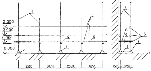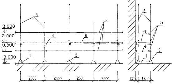 1 - подкладки; 2 - башмаки; 3 - стойки; 4 - поперечины; 5 - продольные связи; 6 - щиты настила