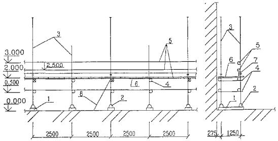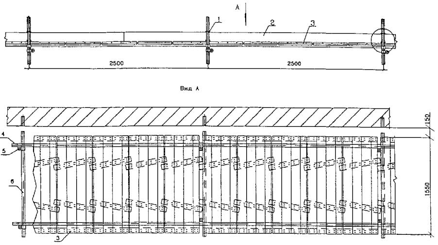 11) Схема установки щитов настила первого рабочего яруса на отм. 2,000 1 - подкладки; 2 - башмаки; 3 - стойки; 4 - поперечины; 5 - продольные связи; 6 - щиты настила Крепление бортовой доски