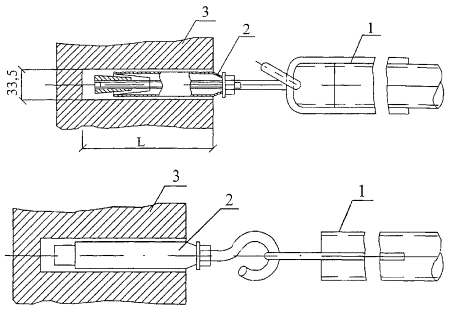 1 - подкладки; 2 - башмаки; 3 - стойки; 4 - поперечины; 5 - продольные связи; 6 - щиты настила; 7 - бортовая доска; 8 - лестница Продолжение рисунка 2 - Схемы очередности установки элементов лесов Рисунок 3 - Схема подъема груза лебедкой Примечание: - Удлиненные пробки применять при ослабленной кирпичной кладке, а также кладке из семищелевого и других видов эффективного кирпича. 1 - поперечина лесов; 2 - инвентарная саморасклинивающаяся пробка; 3 - кирпичная кладка; L - глубина гнезда для пробки.