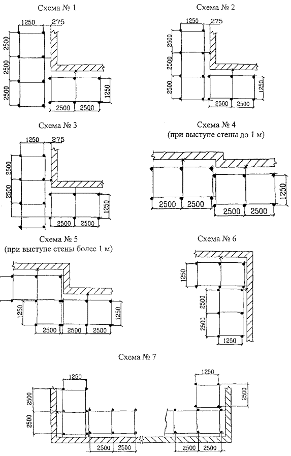 Рисунок 4 - Типовое крепление лесов инвентарными пробками Рисунок 5 - Схемы установки лесов при различной конфигурации зданий