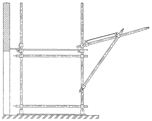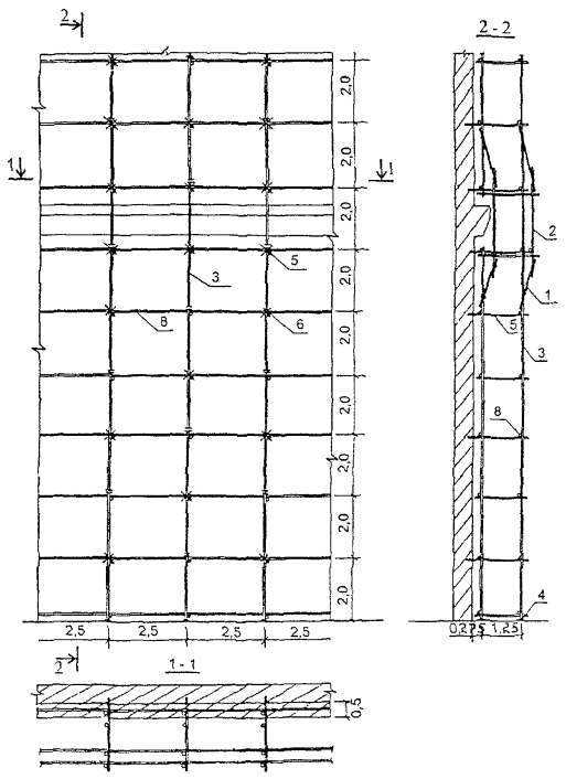 1 - подкладки; 2 - башмаки; 3 - стойки; 4 - поперечины; 5 - продольные связи; 6 - щиты настила Продолжение рисунка 2 - Схемы очередности установки элементов лесов - установку на хомутах с первого рабочего яруса по внешнему ряду стоек на высоте 2,5 м второй нитки ограждения первого рабочего яруса и бортовой доски с креплением ее скобами согласно схеме 13 рисунка 2;. Последующие ярусы устанавливаются в той же последовательности, как и первый ярус; - закрепление сваркой стальных полос от труб заземления после установки лесов первого яруса к стойкам в местах, указанных на монтажной схеме; - установку дополнительных связей и дополнительных ригелей на уровне настила 1-го рабочего яруса на отм. 2,000 м; - перекладку щитов настила с 1-го монтажного яруса на 1-ый рабочий ярус с одновременной установкой перильных ограждений. Сразу по окончании укладки щитов настила на длине одной секции (2 м) устанавливается перильное ограждение с его фиксированием, обеспечивающим устойчивость щитов настила от опрокидывания; - установку последующих ярусов в той же последовательности, как 1-ый ярус; - монтаж одновременно с лесами лестничных секций лесов. Причем, на рабочих ярусах решетки ограждения этих секций устанавливаются с четырех сторон; - подъем элементов лесов лебедкой согласно приведенной на рисунке 3 схеме. Каждые четыре яруса (8 м) по краям лесов ставятся диагональные связи, которые набираются из 2-х длинных связей и крепятся к стойкам поворотными хомутами. Крепление лесов к стене производится при помощи металлических саморасклинивающихся пробок, закладываемых в пробиваемые в стене отверстия. Крепление лесов к стене производится согласно рисунку 4. Приведенная последовательность сохраняется при установке и креплении лесов на зданиях различной конфигурации в соответствии с рисунками 5÷ 10. По установленным лесам устраивается защитное ограждение (сетка, пленка, брезент). 10) Схема установки поперечин с креплением пробками к стене на отм 2,000