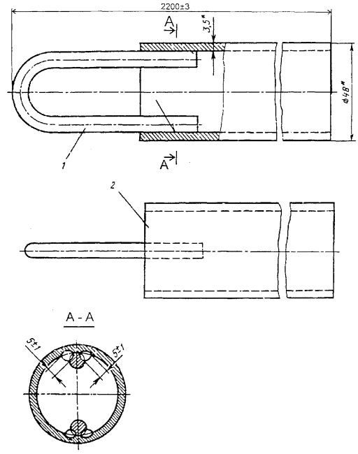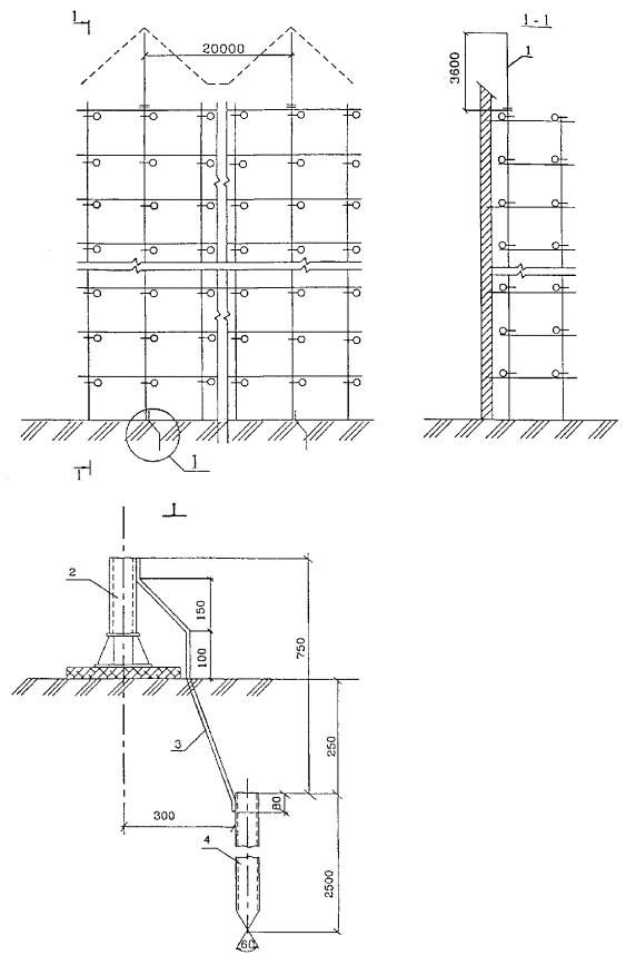 в) в оконный проем (2 вариант) 1 - раскос; 2 - стойка; 3 - поперечина; 4 - инвентарная пробка; 5 - связь Рисунок 10 - Схема крепления лесов при наличии оконных проемов 2.7 Молниеприемники устанавливаются после установки стоек на высоту 8 м (4 яруса) и затем по мере наращивания стоек лесов их переставляют на вышележащие ярусы каждый раз, плотно прикрепляя к стойкам. Расстояние между молниеприемниками должно соответствовать проекту согласно рисунку 11. 1 - молниеприемник l = 3600; 2 - стойка лесов; 3 - полоса 4´25´820 мм; 4 - труба заземления L = 2500 мм. Рисунок 11 - Грозозащитное устройство 2.8 Надежность затяжки гаек болтов в хомутах должны проверяться руководителем монтажа сразу по окончании монтажа яруса. Достаточность затяжки болтов проверяется пробной заверткой гаек ключом на выдержку. При завертывании гаек на затяжных болтах хомутов вставлять в ключ прокладки запрещается, нельзя также наращивать ручку ключа 2.9 Демонтаж лесов осуществляется под наблюдением инженерно-технического работника, ответственного за соблюдение правил монтажа и демонтажа лесов и соответствие лесов проекту, а также за соблюдение правил безопасности работ и сохранность элементов лесов. 2.10 К демонтажу приступают только после того, как работы с лесов закончены и с настилов сняты все материалы, инвентарь, инструменты. 2.11 До начала разборки ответственный руководитель по монтажу должен осмотреть леса и ознакомить рабочих с последовательностью и способом разборки, мерами, обеспечивающими безопасность работ. 2.12 Все дверные проемы первого этажа на участке разборки лесов должны быть защищены, а проходы полностью ограждены. 2.13 Демонтаж лесов начинают после снятия защитного ограждения с верхнего яруса и ведут поярусно сверху вниз в следующей последовательности: - снимаются бортовые доски и перила ограждения; - демонтируются стойки, стыковые соединения, которые находятся выше настила разбираемого яруса лесов и раскосы в пределах разбираемого яруса; - снимаются щиты настила, начиная с края лесов, часть щитов переносится на ярус ниже для подмащивания при разборке лесов; - снимаются крепления к стене; - снимаются ригели. 2.14 Лестничная клетка разбирается одновременно с лесами в следующей последовательности: перила площадок, стойки, стыки которых расположены выше площадок в данном ярусе, щиты верхних площадок и лестницы. 2.15 После окончания демонтажа верхнего яруса рабочие переходят на нижележащий ярус, временно подмащиваясь на нем, и заканчивают разборку каркаса вышележащего яруса, снимаются поперечные и продольные связи. При этом хомуты освобождаются только от стоек, оставаясь закрепленными на поперечинах, связях и других элементах лесов. 2.16 Элементы лесов при помощи блоков, лебедки и пеньковых канатов спускаются вниз. Сбрасывание отдельных элементов лесов с высоты категорически запрещается. Мелкие элементы перед спуском вниз укладываются в специальные ящики. 2.17 Внизу с поперечин и других элементов снимаются хомуты, элементы лесов раскладываются по маркам и укладываются в контейнер для перевозки на новый объект или на склад. При сортировке элементы, требующие ремонта или замены, складируются отдельно и направляются в мастерские для ремонта. 2.18 При демонтаже лесов не допускается соприкосновение трубчатых элементов с электропроводами. 2.19 Каждая партия лесов, состоящая из н