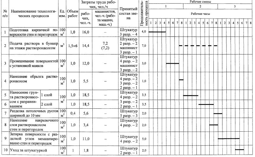 6.7 Технико-экономические показатели на выполнение 100 м2 улучшенной штукатурки составляют: - затраты труда, чел.-час: рабочих........................................................................ 69,6 машиниста................................................................... 7,2 - затраты машинного времени, маш.-ч............................ 7,2 - продолжительность работ, час....................................... 15,0 Таблица 13 - Календарный план производства работ по устройству улучшенной штукатурки внутренних стен и перегородок (Измеритель конечной продукции - 100 м2 поверхности) Таблица 14 - Калькуляция затрат труда и машинного времени на производство работ по устройству высококачественных штукатурных покрытий внутренних стен и перегородок (Измеритель конечной продукции - 100 м2 поверхности)