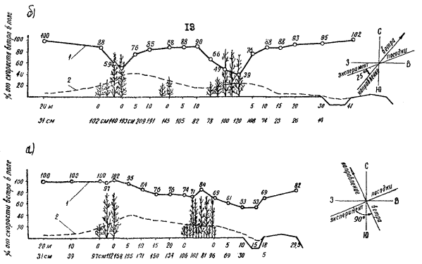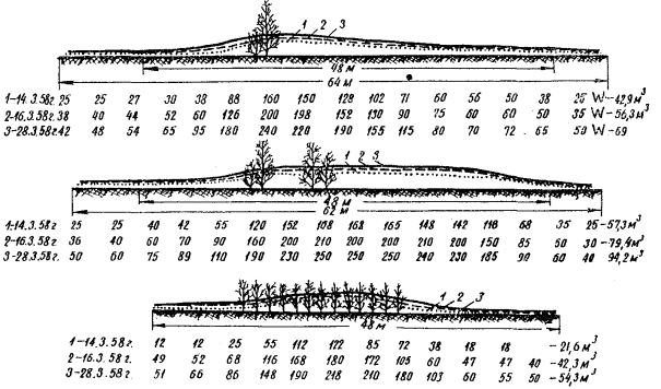 МОСКВА 1964 ПРЕДИСЛОВИЕВ связи с интенсивным развитием автомобильного транспорта с каждым годом возрастают требования к обеспечению безопасности и бесперебойности движения на автомобильных дорогах, особенно в зимний период. Большое значение в настоящее время в защите дорог от снежных заносов приобретают, в частности, снегозадерживающие насаждения. В результате специальных исследований Союздорнии были разработаны конструкция и правила размещения снегозадерживающих насаждений, которые вошли в «Технические правила ремонта и содержания дорог» (ВСН 22-63, Минавтошосдор РСФСР). Однако многие из созданных ранее снегозадерживающих полос не обеспечивают защиты дорог от снежных заносов в условиях сильного снегопереноса. Это объясняется прежде всего слишком близким расположением снегозадерживающих насаждений к дороге и, кроме того, неудовлетворительной агротехникой выращивания насаждений. Отдел ремонта и содержания дорог Союздорнии провел ряд экспериментальных исследований по повышению эффективности снегозадерживающих насаждений, результаты которых отражены в настоящих «Предложениях». «Предложения» разработаны канд. с/х наук Г.И. Матякиным при участии в исследованиях и опытных работах мл. научных сотрудников В.Д. Пряхина, З.А. Прохоровой, В.Д. Казанского. В опытных работах также принимали участие работники дорожно-эксплуатационной службы. Замечания и предложения просим присылать по адресу: г. Балашиха-3, Московской области, Союздорнии. ЗАМЕСТИТЕЛЬ ДИРЕКТОРА СОЮЗДОРНИИ кандидат технических наук Н. ГОРЕЛЫШЕВ ВВЕДЕНИЕВ настоящее время, даже на важнейших автомобильных дорогах, имеющих снегоочистительную технику, затруднения в движении, вызываемые снежными заносами, пока остаются систематически повторяющимся явлением. Снежные заносы резко снижают автомобильное движение. Так, зимой 1955 - 1956 гг. во время снежных заносов на дороге Москва - Харьков и Москва - Куйбышев средняя скорость движения автомобилей составляла от 0,1 до 2,4 км/час. На автомобильных дорогах с интенсивным движением транспортные потери от перерывов и снижения скорости движения при заносах за одни сутки могут даже превзойти годовые затраты на зимнее содержание дорог. Правильное сочетание и соотношение мероприятий по снегозащите и снегоочистке дорог является главным условием рациональной организации зимнего содержания дорог. Следует учитывать, что снегоочистка или постановка щитов дают временный эффект, т.е. до очередного заноса, тогда как эффективность снегозадерживающих насаждений постоянна, т.е. пока существуют эти насаждения. Поэтому правильно созданные снегозадерживающие насаждения являются самым надежным и наиболее экономичным средством защиты дорог от снежных заносов. Тем не менее об этом проявляется пока еще мало заботы. Практика дорожного хозяйства показывает, что из денежных средств, расходуемых на зимнее содержание дорог, как правило, не более половины затрачивается на мероприятия по снегозащите, в том числе и на снегозадерживающие насаждения. Автомобильные дороги еще плохо защищены от снегозаносов, что в значительной степени объясняется низким качеством снегозадерживающих полос, созданных по действовавшим до настоящего времени инструкциям, а также недостаточным учетом объема снегопереноса. Так, при объеме снегопереноса более 50 