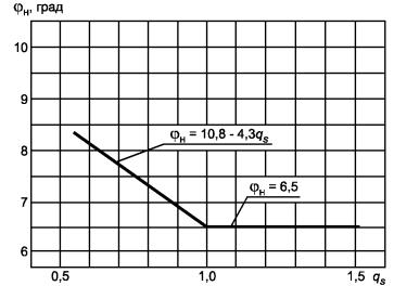 А - диапазон значений qs для автокранов, автобетоносмесителей, рефрижераторов, контейнеровозов категории N3, двухэтажных автобусов категории М3; А1 - диапазон значений qs для автомобилей-цистерн категории N3, прицепов цистерн категорий О3, О4; Б - диапазон значений qs для рефрижераторов, самосвалов категории N3, одноэтажных автобусов категории М3, прицепов категорий О3, О4; В - диапазон значений qs для автокранов, самосвалов, рефрижераторов категории N2, бортовых автомобилей категории М3, автобусов категории М2 и прицепов категории O2; Г - диапазон значений qs для бортовых автомобилей категорий N1, N2, фургонов категории N1, автомобилей повышенной проходимости категории М1; Д - диапазон значений qs для автомобилей категории M1 (за исключением автомобилей повышенной проходимости), прицепов категории O1 Рисунок 2 - Зависимость угла aн опрокидывания АТС на стенде от коэффициента поперечной устойчивости qs АТС различных категорий и типов (Зоны А, А1, Б, В, Г, Д приведены для справок) Для автомобилей-контейнеровозов, предназначенных для эксплуатации на дорогах категорий I и II по [2], при загрузке более 0,8 полного объема контейнера и расположении центра масс балласта в геометрическом центре контейнера минимально допустимое значение aс.у равно 19°. 4.3.5 Угол крена j подрессоренных масс определяют при угле наклона платформы, при котором происходит отрыв всех колес одной стороны одиночного АТС или всех колес одного из звеньев автопоезда от опорной поверхности. Максимальное допустимое значение угла крена j подрессоренных масс в центре масс АТС, полученное в результате испытаний, не должно превышать предельных значений jн, заданных в зависимости от коэффициента поперечной устойчивости qs. При этом АТС всех категорий (аналогично 4.3.4) разделены на две группы, каждой из которых соответствует своя зависимость jн = f(qs): - при qs £ 1,0 jн = (10,8 - 4,3qs)°; - при qs > 1,0 jн = 6,5°. (5) Критерием соответствия нормативным требованиям данного стандарта является условие j £ jн, (6) где jн - предельно допустимое значение угла крена. График зависимостей (5) и (6) представлен на рисунке 3. Рисунок 3 - Зависимость угла крена jн подрессоренных масс АТС от коэффициента поперечной устойчивости qs 4.4 Устойчивость при испытаниях «рывок руля»4.4.1 Требования распространяются на АТС категорий М и N. 4.4.2 Курсовую устойчивость оценивают характеристиками поворачиваемости и чувствительности к управлению автомобиля, забросом угловой скорости и временем 90 %-ной реакции по угловой скорости. 4.4.3 Характеристика поворачиваемости и чувствительности к управлению автомобиля представляет собой зависимость угла поворота рулевого колеса dн от установившегося бокового ускорения ау. 4.4.4 Углы поворота рулевого колеса, определенные по 4.4.3 для автомобилей категорий М1, М2 и N1 должны находиться в пределах, установленных в таблице 2. Таблица 2
