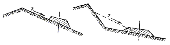 где все обозначения прежние, а время добегания с любого частного бассейна равно времени добегания паводка с основного бассейна, т.е. ti = tg. Построение расчетного гидрографа в створе проектируемого сооружения производят путем суммирования ординат всех гидрографов паводков в существующих сооружениях и с основного бассейна. Наиболее сложен случай нахождения на водосборе нескольких параллельных дорог, различных по категории и назначению. Расчет максимальных расходов с учетом такой зарегулированности водосборов производят следующим образом: 1) вычисляют расчетные расходы требуемой ВП для створа (I) самой верхней существующей дороги по формуле: 2) определяют расчетные расходы для створа (II) нижележащей дороги: Qpi II = Qpi I - II + λpi I ΣQci I Kтi I - II (4.11) 3) определяют расчетный расход для заданного (III) створа, проектируемого сооружения: Qpi III = Qpi II - III + λpi II ΣQci II Kтi II - III (4.12) В формулах (4.10), (4.11), (4.12) приняты обозначения: Qpi I, I - II, II - III - максимальные расходы воды, определяемые соответственно по частям водосбора, ограниченным водоразделом и створом I верхней дороги, между створом I верхней дороги и нижележащим створом II, между створом II и створом проектируемой дороги; λpi I, II - переходные коэффициенты от ВП расчетных паводков соответственно на I и II существующих дорогах к заданной ВП; Qci I, II - максимальные расходы в сооружениях соответственно на первой и второй дороге; Kтi I - II, II - III - коэффициенты трансформации расходов соответственно между створом I и II и створами II - III существующих дорог. 4.2. Сброс части стока в смежное сооружение. При проектировании малых водопропускных сооружений встречаются случаи, когда из-за низкой отметки одного из водоразделов (рис. 4.3), разделяющих смежные водосборы у земляного полотна, невозможно у сооружения создать необходимый по допускаемым размерам аккумуляции подпор воды. Такие случаи характерны при косых пересечениях распластанных логов и логов на косогорах, расположенных поперек него. Устройство на водоразделах разделительных валов и дамб обвалования особенно на пахотных землях и в равнинной местности не всегда может быть возможно или экономически нецелесообразно. Поэтому возникают условия, при которых часть воды, поступающей с одного бассейна, можно сбросить в смежный, расположенный ниже пруда аккумуляции, что позволит более эффективно использовать явление аккумуляции перед низовым сооружением в случае его незагрузки или хороших высоких водоразделов в замыкающем створе. При высоких водоразделах (рис. 4.3, б) сброс части стока в соседнее сооружение в отдельных случаях может оказаться экономически целесообразнее варианта устройства сооружений без искусственного перераспределения стока между ними. Необходимость проработки таких вариантов обуславливает потребность в конкретной расчетной схеме перераспределения стока с определением расходов низового и верхового сооружений, сбросного расхода и оценки затрат на обеспечение сброса, исключающее возможность размывов откосов земляного полотна, образования оврагов и эрозионного понижения водосбросного русла. Рис. 4.3 Схема к расчету искусственного распределения максимального стока: 1 - водораздел; 2 - проектная линия продольного профиля дороги; 3 - верховое водопропускное сооружение; 4 - низовое сооружение; 5 - сбросной лоток Расчетные расходы в сооружении с учет