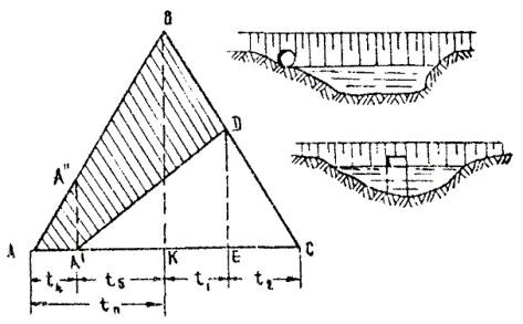 Форма гидрографов паводков при определении Qpc принимается в виде равнобедренного треугольника. Для иного очертания гидрографа нужно использовать рекомендации (9). При конфигурации живого сечения водотока с четко выраженными руслом и пойменными частями или участками с резкими различиями формы поперечного сечения (овраги, крутые лога и т.п.), определять объем пруда (в м3) рекомендуется по формуле (рис. 2.5): где:
