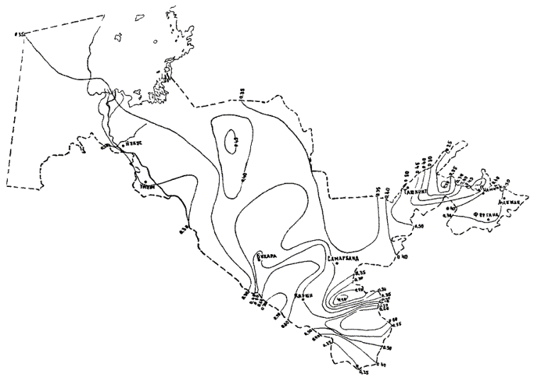 Рис. 7.2 Карта-схема распределения расчетного коэффициента стока a по территории Ирака. 7.4. Региональные нормы определения максимальных расходов воды в Узбекской ССР разработаны (20) в 1976 - 80 гг. Шахидовым А.Ф. (МАДИ). Они предусматривают расчеты максимального дождевого стока с малых водосборов до 100 км2 с использованием формулы (2.1). Расчетные интенсивности дождей часовой продолжительности 1 % ВП приведены (мм/мин) на рис. 7.3. Для аналитической оценки коэффициента редукции часового дождя предложена формула: