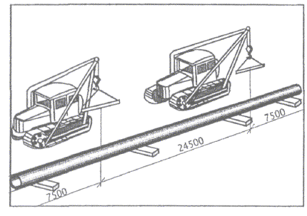 2.8 Рабочие выбирают недобор грунта из приямков и со дна траншеи. Толщину срезки недобора грунта определяют по ходовой визирке и визиркам на бровке траншеи. После этого они, по двое на каждом конце звена труб, размечают с помощью рулеток место строповки звена для каждого крана-трубоукладчика и машинисты устанавливают краны-трубоукладчики так, чтобы их стрелы находились над отмеченными местами, и опускают крюки с траверсами. Монтажники заводят стропы-полотенца с двух концов звена труб и цепляют их за крюки траверс, после чего подают команду на подъем звена. Каждую траверсу обслуживают двое монтажников-трубоукладчиков. Машинисты кранов-трубоукладчиков приподнимают звено труб на 20 - 30 см. Убедившись в надежности строповки, они поднимают звено еще на 1 м и опусканием стрел одновременно направляют его в траншею. На расстоянии 30 см от дна траншеи опускание звена прекращают.