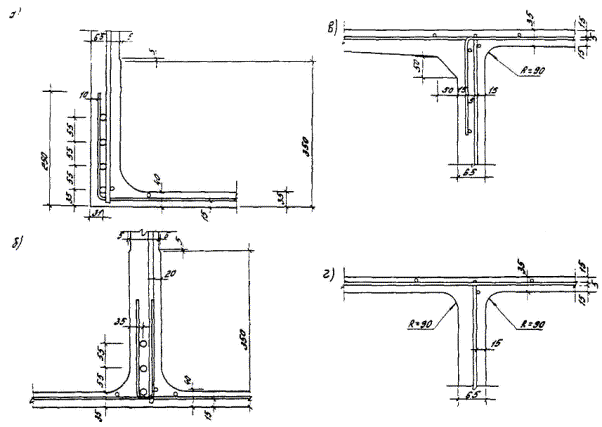 do ;hw, d1- расстояние от осей ребер и полок до шарниров; γ γ = 2; γ1 = 0,75 - при действии нагрузки и γ = γ1 = 1 - при действии реакций; d0 h0, d1- расстояния от центров тяжести вутов до шарниров консолей, ребер и полок (рис. 2, ж);