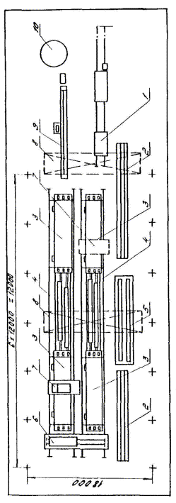 Расчет коробчатого настила перекрытия на динамические воздействияРасчет производим в соответствии с положениями «Руководства по проектированию конструкций, испытывающих динамическое воздействие» (Научно-технический отчет ЦНИИСК, шифр 8НО3Б0060, М., 1979) и «Инструкции по расчету несущих конструкций промышленных зданий и сооружений на динамические нагрузки» (М.: Стройиздат, 1970). Коробчатый настил перекрытия рассчитываем на действие вертикальных динамических нагрузок от ткацких станков. Номинальная длина коробчатого настила - 18000 мм, сетка колонн здания - 6×18 м. Поперечное сечение коробчатого настила показано на рис. 21 схема расстановки станков приведена на рис. 21. Рис. 21. Схема расстановки станков Частотные характеристики ткацких станков даны в табл. 4. Таблица 4