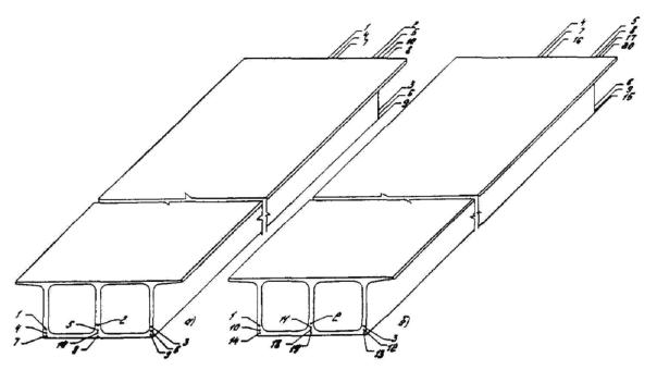 19. Прогибы консолей верхней полки коробчатого настила от нагрузки и реакций находятся из расчета рамы (рис. 2, ж), полученной путем врезания шарниров в ребра в месте начала нижних вутов, а также в начале вутов верхней полки возле вторых от краев ребер (рис. 2, б, ж). При этом учитывается, что нагрузки и реакции на консолях верхней полки вызывают деформации только верхних полок и внешних ребер крайних пустот коробчатого настила. Прогибы консолей верхней полки при наличии трещин в полках и ребрах вдоль вутов (рис. 2, ж) определяются по формуле