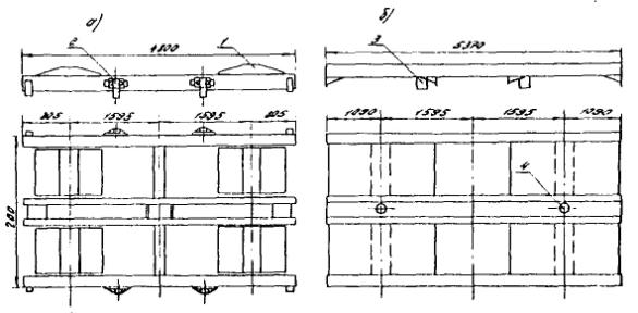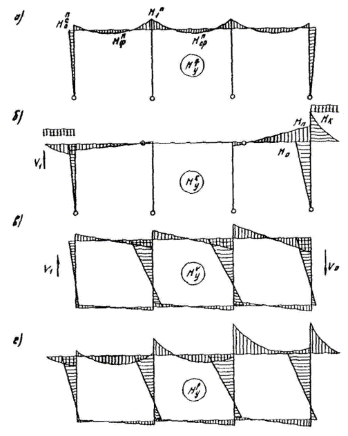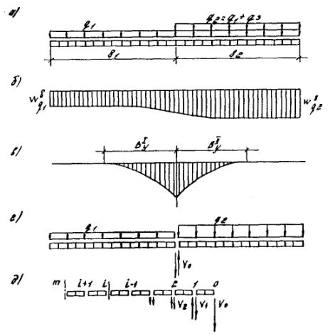 При отсутствии трещин в коробчатых настилах, расположенных с обеих сторон от нулевого шва (рис. 1, г, д), ординаты эпюр поперечных изгибающих моментов Mvy (рис. 3) одинаковые и получаются в результате сложения эпюр в однокоробчатых настилах. Реакция между последними