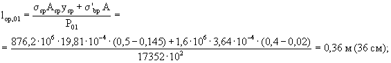 σsp1 = σsp - σ1 - σ2 - σ3 - σbp = 984,2 - 66 - 30 - 12,0 = 876,2 МПа (8762 кгс/см2). Определяем усилие обжатия с учетом первых потерь напряжения P01 = σsp1 Asp - σ′bp · A′ = 876,2 · 106 · 19,81 · 10-4 - 1,6 · 106 · 3,64 · 10-4 = 17352 · 102 Н (173520 кгс);