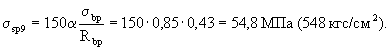 С учетом вторых потерь σspII = 857,4 - 40 - 54,8 = 762,6 МПа (7626 кгс/см2); PII = 762,6 · 106 · 19,81 · 10-4 = 15107 · 102 Н (151070 кгс); l02 = 0,36 м (36 см). Проверка сжимающих напряжений σbp. Наибольшие сжимающие напряжения σbp имеют место в сечении, проходящем через конец приопорной зоны длиной lp, поскольку здесь разгружающее влияние момента наименьшее. Напряжения σbp определяются на уровне нижнего крайнего волокна (т.е. при у = у0 = 0,5 м) при действии усилия PI с учетом первых потерь. PI = 16977,2 · 102 Н;