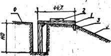 Рис. 3. Шаблон для разбивки центров ям: 1—шнур, натянутый по линии бровки; 2—колышки, забиваемые по линии бровки; 3—шпильки или колышки, забиваемые по центру ям Ямы бурят вертикально опущенным буром диаметром 350 мм на глубину 1,1 м. Глубину ямы контролируют шаблоном (рис. 4). При слабых грунтах на дне ямы устраивают основание из щебня или песчано-гравийной смеси толщиной 10—15 см с уплотнением слоя ручными трамбовками. Ямы в этом случае бурят на соответственно большую глубину.