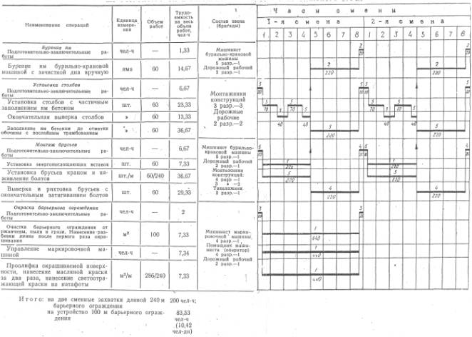 Водителя бортовой автомашины, доставляющей столбы и брусья к месту установки, в состав звеньев не включают. Участок разбивают на сменные захватки длиной по 120 м и работы ведут поточным методом поочередно на четырех захватках. Звено по бурению ям первые 4 ч смены занято на третьей захватке монтажом брусьев. Вторую половину смены дорожный рабочий размечает по шаблону положение центров ям на первой захватке и отмечает их колышками, зачищает при необходимости дно ям и откидывает лишний грунт от бровки, а в конце смены помогает машинисту очищать бур. Машинист управляет бурильно-крановой машиной. Звено по установке столбов ведет работы на второй и третьей захватках. На второй захватке дорожные рабочие устраивают бетонные подушки на дне ям. Монтажники конструкций опускают в ямы и центрируют столбы и вместе с дорожными рабочими заполняют ямы на 1/3 глубины бетоном. Затем рабочие переходят на третью захватку и после установки и укрепления брусьев заполняют ямы бетоном до верха. Бетон доставляют автомобилем-самосвалом через 2 ч четыре раза в смену. Звено по монтажу брусьев ведет работы на третьей захватке. Машинист бурильно-крановой машины при помощи кранового оборудования поднимает брус, подает его к месту установки и удерживает на весу при монтаже. Такелажник стропит брусья, дорожный рабочий и монтажник конструкций 3 разр. наживляют их анкерными болтами. Второй монтажник конструкций 3 разр. устанавливает и закрепляет болтами энергопоглощающйе вставки. Монтажник конструкций 4 разр. контролирует и руководит выправлением положения брусьев и вместе с двумя монтажниками 3 разр. и одним 2 разр. окончательно затягивает болты. На четвертой захватке, равной двум сменным, звено по окраске ограждения ведет все работы по окраске барьерных ограждений и установке светоотражающих устройств. Машинист разметочной машины управляет машиной, а его помощник (оператор) управляет рабочими органами при нанесении краски. Дорожный рабочий очищает барьерное ограждение, размечает границы окраски черной краской. Рекомендуется организовать работу звена по окраске ограждений через смену по мере накопления фронта работ. При небольшом объеме работ отдельные захватки могут быть совмещены. IV. ГРАФИК ВЫПОЛНЕНИЯ ПРОИЗВОДСТВЕННОГО ПРОЦЕССА НА УСТРОЙСТВО 240 м БАРЬЕРНОГО ОГРАЖДЕНИЯ ИЗ СТАЛЬНОГО БРУСА