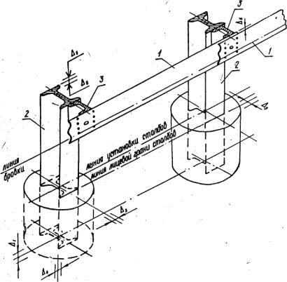 Схема барьерного ограждения с указанием предельных отклонений: 1—стальной брус; 2—опора из двутавра; 3— энергопоглощающая вставка Примечания. 1. Барьерные ограждения должны иметь правильную геометрическую линию в плане и в продольном профиле (прямую или плавно очерченную кривую). 2. Линия барьерного ограждения должна проходить на установленном проектом расстоянии от линии бровки земляного полотна. 3. Высота барьерного ограждения должна быть не менее 0,8 м. 4. Все гайки должны быть надежно затянуты. 5. Масляная краска должна покрывать поверхность барьерного ограждения ровным слоем, без припусков и наплывов. Местные искривления линий и закраски в сопряжении двух цветов не должны превышать 5 мм.