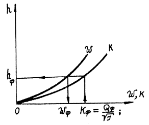 Рис.6. Расходная и скоростная характеристики потока Графики расходной и скоростной характеристик строятся для различных поперечных сечений водоотводных сооружений (рис.7). Для построения кривых расходной и скоростной характеристик используются следующие зависимости (рис.8): площадь поперечного сечения потока: