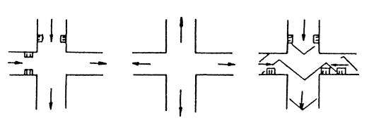 На основе расчета скорости протекания потока в водоотводном сооружении решается вопрос об его укреплении. Допустимые скорости течения воды указаны в табл.1. 4. РАЗМЕЩЕНИЕ ДОЖДЕПРИЕМНЫХ КОЛОДЦЕВВодоприемные колодцы предназначены для приема поверхностных вод, стекающих с территории кварталов и улиц. Для приема воды на колодцах установлены водоприемные решетки. Водоприемные колодцы помещаются на улицах и площадях: а) в пониженных местах, не имеющих стока; б) на перекрестках улиц в лотках проезжей части; в) у въездов и выездов в кварталы и микрорайоны; г) в лотках проезжей части между перекрестками. В этом случае расстояние между колодцами назначается по нормам (от 50 до 80 м, в зависимости от уклона) или определяется расчетом. Первый водоприемный колодец устанавливается от водораздельной линии на удалении 50…200 м. Расстояние между дождеприемными колодцами легко определить на основании гидравлического расчета лотка проезжей части. Размещение колодцев на перекрестках показано на рис.9; основная цель - обеспечить удобство пешеходам при переходе улиц и отвести воду из лотков проезжей части. Рис.7. Поперечное сечение кюветов Рис.8. Схема к расчету гидравлического радиуса потока Рис.9. Схемы размещения водоприемных колодцев на перекрестках улиц Таблица 1Значения средней неразмывающей скорости потока Vнр (м/с) при глубине потока h (м)
