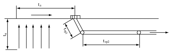 где Н - среднегодовое количество атмосферных осадков в мм за период не менее 15 лет; dв - средневзвешенная величина дефицита влажности за период не менее 5 лет (определяется по месячным количествам жидких осадков, мм). Продолжительность расчетного дождя t принимается равной продолжительности добегания воды от наиболее удаленной точки бассейна до расчетного сечения и складывается из времени добегания воды от наиболее удаленных точек квартала и микрорайона до лотка проезжей части улицы (tk), времени протекания воды по лотку до ближайшего водоприемного колодца (tл), времени протекания воды по трубам водосточной сети до рассматриваемого расчетного сечения (tтp). Таким образом, (рис.12):