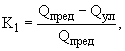 где Qp - расчетный расход; Qпред - расход предельного периода; K - переходный коэффициент, К=K1∙К2, где K1 - коэффициент уменьшения расхода за счет пропуска его части по лоткам проезжей части улиц, К2 - коэффициент уменьшения расхода за счет регулирующего влияния свободной емкости сети водостоков. Коэффициент K2 в среднем принимают равным 0,75. Коэффициент K1 определяют из выражения