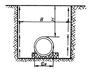 Н - высота засыпки над верхом трубы, м (рис.13); Вт - расчетная ширина траншеи на уровне верха трубы: принимается с учетом переходной ширины Впер=(1,8-2,2)Dнар; если действительная ширина траншеи больше Впер, то принимается Вт=Впер, если меньше, то принимается Вт=B∙Dнap - наружный диаметр трубы; Kт - коэффициент вертикальной нагрузки от грунта в траншее. Определяется по формуле