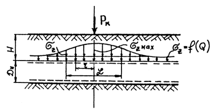 где G0 - собственный вес трубы; rср=(Dвн + Временная нагрузка на трубу принимается равной нагрузке на заднее спаренное колесо расчетного автомобиля, приложенной на поверхности земли. Для учета условий передачи нагрузки от колес через грунт засыпки при определении временной нагрузки используют формулы теории упругости (принимая нагрузку от колес в виде сосредоточенной силы). Расчетная величина сосредоточенной силы, приложенной на поверхности грунта,