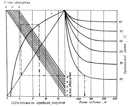 Уровень загрузки дорог определяют по приложению 2. 10. Средние скорости движения потока автомобилей на уклонах можно определять по методу, разработанному Московским автомобильно-дорожным институтом. 11. Осредненные показатели себестоимости перевозок в зависимости от продольных уклонов показаны на номограмме (рис.1). 12. Приведенные расходы на ремонт и содержание дорог Д определяются с учетом коэффициента приведения по формуле