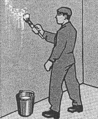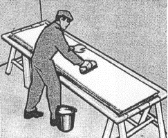 Рисунок 28 – Прирезка стыков обоев Рисунок 29 – Отгибка и промазка кромок полотнищ 2.38 Вспененные виниловые обои, а также обои из твердого винила и стеклообои не требуют такой тщательной подготовки поверхности под наклейку, как другие виды, т.к. сильно выраженный рельеф верхнего слоя делает незаметными дефекты стен. 2.39 При использовании структурных виниловых обоев, а также стеклообоев и обоев на флизелиновой основе используется новая технология оклеивания стен, показанная на рисунках 30–35. Обойный клей наносится малярным валиком или щеткой не на обои, а непосредственно на поверхность, к которой они приклеиваются. Ширина наносимого клея должна немного превышать ширину рулона обоев. Особенно тщательно клей наносится в угловых стыках и вдоль плинтусов. Обои наклеиваются не позднее 30 минут после нанесения клея без предварительного нарезания рулона на полотна. Полотно накладывается на стену и разглаживается сверху вниз от центра к краям, чтобы удалить пузырьки воздуха. Приклеенное к стене полотно отрезается от рулона у плинтуса с помощью обойного ножа. Излишки клея удаляются влажной тряпкой. Последующие полотна клеятся встык. Окраску стеклообоев можно производить через 3 часа после приклеивания полотна, флизелиновых обоев - через 24 часа. При ремонте обои снимаются полностью без увлажнения. Рисунок 30 – Нанесение клея на стену