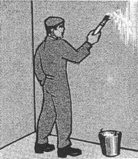 Рисунок 1 - разбивка линии верха обоев намеленным шнуром 2.22 Отбивку линии верха обоев выполняют с пола без лестниц и козелков специальным приспособлением (роликом), снабженным грифелем, укрепленным на ползуне, который перемещается по рейке и может быть закреплен в любом положении. При отбивке линии верха оклеивания ползун устанавливают на расстоянии 10-15 см от края рейки, имеющей колесико, а затем рейку прижимают к стене так, чтобы колесико касалось потолка. Перемещая рейку в установленном положении параллельно линии потолка, получают ровную линию, прочерченную грифелем. 2.23 Бетонные поверхности перед оклеиванием их виниловыми обоями на бумажной основе должны быть дополнительно промазаны клеем по всей поверхности, оклеены оберточной бумагой (отбор от газетной) и просушены. Бетонные поверхности перед оклеиванием их виниловыми обоями на тканевой основе должны быть дополнительно обработаны шпатлевкой, ошлифованы и огрунтованы, как при масляной окраске. 2.24 Оштукатуренные поверхности перед оклеиванием их виниловыми обоями на бумажной основе должны быть дополнительно прошпатлеваны «на сдир» с последующем шлифованием, просушены до влажности не более 8% и промазаны клеем по всей поверхности за 10-15 минут перед оклеиванием с дополнительным оклеиванием поверхности оберточной бумагой (отбор от газетной). Оштукатуренные поверхности перед оклеиванием их виниловыми обоями на тканевой основе должны быть дополнительно обработаны шпатлевкой с последующим шлифованием шпатлевочного слоя и грунтованием. 2.25 Поверхности всех видов листовых материалов перед оклеиванием их виниловыми обоями на бумажной основе должны быть оклеены оберточной бумагой (отбор от газетной) по всей поверхности. Поверхности всех видов листовых материалов перед оклеиванием их виниловыми обоями на тканевой основе дополнительно должны быть прошпатлеваны «на сдир» масляной шпатлевкой и соответственно огрунтованы. 2.26 Сплошное шпатлевание поверхностей не масляными шпатлевками должно выполняться «на сдир» по огрунтованной соответствующей грунтовкой поверхности с использованием шпатлевок, КЛМ или других на основе заменителей олифы. Сплошное шпатлевание поверхностей масляными шпатлевками должно выполняться механизированным способом за один раз со шлифованием слоя. 2.27 Шпатлевание должно осуществляться приемом «на сдир» шпателем с резиновым наконечником после предварительного грунтования поверхности. Шлифование поверхностей, прошпатлеванных сплошным слоем, должно выполняться (после высыхания шпатлевки) с использованием шлифовальной бумаги, укрепленной в колодке с войлочной подложкой, до полного выравнивания поверхности с последующим ее обеспыливанием путем обметания волосяной щеткой или маховой кистью. 2.28 Не допускается протирка прошпатлеванной поверхности ветошью или другими материалами во избежание втирания пыли в поры шпатлевки, что в дальнейшем может препятствовать хорошей адгезии при приклеивании обоев. 2.29 Перед оклеиванием поверхности виниловыми обоями на тканевой основе отшлифованные поверхности должны быть огрунтованы под цвет оклеиваемых обоев. 2.30 Оклеивание поверхностей оберточной бумагой (отбор от газетной) осуществляют по свежепроклеенной поверхности полосами или листами бумаги, которые промазывают равномерным слоем кл