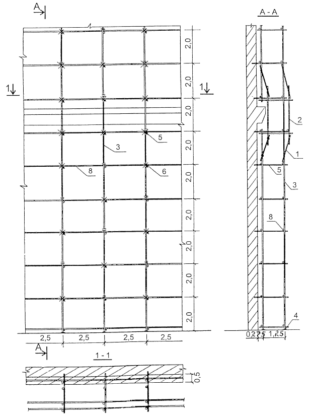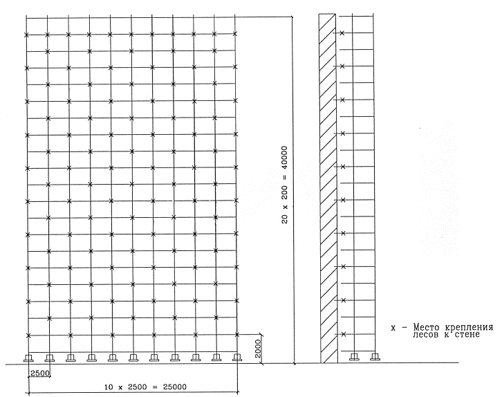 ИЛЛЮСТРАЦИИрис.1 Схема установки лесов по наружному ряду стоек. Общий вид. 1 - башмак опорный; 2 - стойка короткая; 3 - стойка длинная; 4 - связь короткая; 5 - связь длинная; 6 – поперечина; 7 - связь диагональная; х - крепление лесов к стене