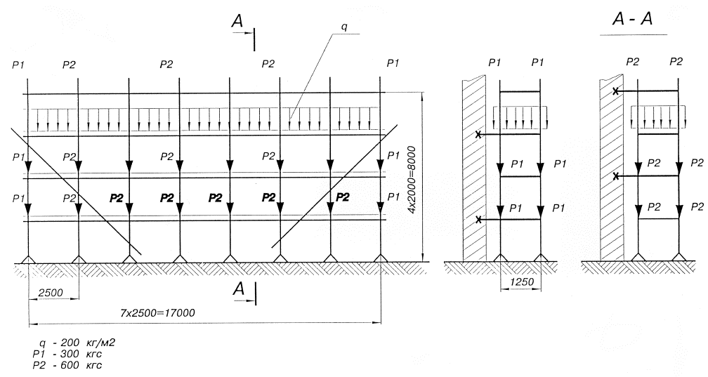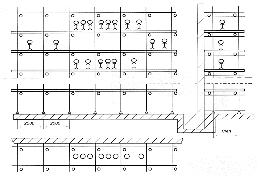 рис. 33. Схема размещения нагрузок. ИСПОЛЬЗОВАННАЯ ЛИТЕРАТУРА1. СНиП 3.01.01-85* "Организация строительного производства" 2. СНиП III-4-80* "Техника безопасности в строительстве" 3. ГОСТ 24258-88 "Средства подмащивания. Общие технические условия" 4. ГОСТ 27321-87 "Леса стоечные приставные для строительно-монтажных работ. Технические условия" 5. ГОСТ 22859-77 "Подъемники автомобильные гидравлические. Общие технические условия" 6. ГОСТ 27372-87 "Люльки для строительно-монтажных работ. Технические условия» 7. Паспорт и инструкция на леса стоечные приставные хомутовые. ЛСПХ 3316 8. В.П.Сукачев, Р.А.Каграманов. Справочник строителя. Средства малой механизации для производства строительно-монтажных работ. Москва, Стройиздат, 1989г. 9. "Указания по установке и безопасной эксплуатации грузоподъемных кранов и строительных подъемников при разработке проектов производства работ" ОАО ПКТИпромстрой 10. ПБ 10-11-92."Правила устройства и безопасной эксплуатации подъемников (вышек)" Госгортехнадзор России |