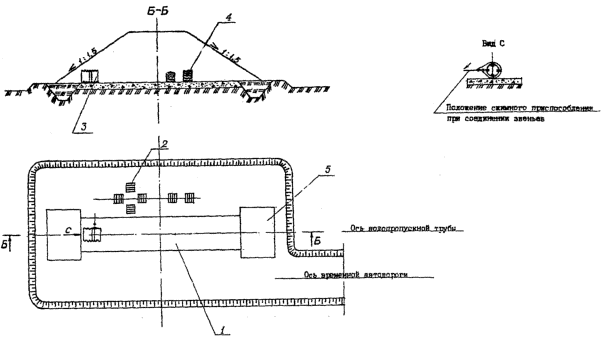 высота засыпки над трубой должна составлять не менее 2.2.13. Опытные стеклопластиковые трубы сооружают в любой время года при условии обеспечения устройства подушки, отсыпки и уплотнения защитной призмы из талой песчано-гравийной смеси. При этом не допускается наличия мерзлых комьев в песчано-гравийной смеси и смерзание смеси до окончания уплотнения. 2.2.14. До накопления необходимого опыта основные работы по строительству сборных стеклопластиковых труб, а именно, устройство подушки, сборка трубы, отсыпка и уплотнение защитной призмы вокруг нее следует выполнять в присутствии представителей из ЦНИИС. 2.2.15. Насыпь за пределами защитной призмы возводит мехколонна (или аналогичная ей организация) в соответствии с требованиями, предъявляемыми к сооружению земляного полотна. 2.2.16. После возведения и стабилизации насыпи над трубой, но не ранее, чем через шесть месяцев после засыпки трубы, для защиты внутренней поверхности трубы от интенсивного, износа устраивают сборный бетонный лоток. 2.3. Указания по организации работ 2.3.1. Все работы по сооружению водопропускной трубы из гофрированного стеклопластика выполняет комплексное звено в составе пяти человек, в том числе: монтажники конструкций: 5 разр. - 1, 4 paзp. - 1, 3 разр. - 1, машинист бульдозера Д-572С 6 разр. - 1; машинист крана КС-3571 6 разр. - 1. Кроме того, для обслуживания механизмов привлекают дежурного слесаря 5 разр., а для обслуживания электрооборудования - дежурного электромонтера 5 разр. 2.3.2. В начале производства работ все монтажники конструкций под руководством мастера разбивают и закрепляют на местности ось трубы, размечают контуры строительной площадки и котлована под гравийно-песчаную и цементно-грунтовые подушки, производят высотную разбивку и нивелирование с привязкой к реперу, расположенному вблизи трубы. В это время машинист бульдозера разравнивает грунт на строительной площадке, а затем приступает к планировке. По окончании планировки монтажники конструкций выгружают лесоматериал, устраивают навесы, размещают оборудование, инвентарь, приспособления, а затем приступают к устройству цементно-грунтовых и гравийно-песчаной подушек. 2.3.3. После тщательного уплотнения гравийно-песчаной подушки монтажникам 5 и 4 разр. приступают к сборке гофрированной трубы из отдельных звеньев, а монтажник 3 разр. вначале разгружает элементы гофрированной трубы, а затем помогает монтажникам 5 и 4 разр. собирать звенья из отдельных элементов. После сборки средних звеньев все монтажники собирают элементы оголовков трубы. Перед засыпкой трубы они тщательно подсыпают и подбивают песчано-гравийной смесью нижние пазухи, обеспечивая боковые откосы подсыпки под углом 40-45 к горизонту. Подбивку осуществляют ручными деревянными трамбовками. Далее все монтажники засыпают трубу горизонтальными слоями