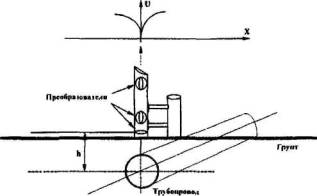 Рис.2.4 Определение оси и глубины заложения трубопровода по минимальному сигналу и измерение тока в трубопроводе индуктивными преобразователями Глубину заложения трубопровода с исключением обваловки определяют по формуле ho = h - hв = Хcр - hв, (2.2) где h - глубина заложения до оси трубопровода с обваловкой, м; ho - глубина заложения трубопровода от дневной поверхности до осевой линии, м; hв - высота вала относительно уровня дневной поверхности, м (рис. 2.3). Без обваловки глубину заложения трубопровода h3 до верхней образующей определяют из выражения h3 = ho - RT, (2.3) где Rt - радиус трубопровода, м. В местах изгиба трубопровода, а также в случае обследования параллельных трубопроводов следует производить измерения глубины в обе стороны от осевой линии, причем конечным результатом выбирают среднее арифметическое значение двух измерений h3 = (X1 + X2)/2 - RT, (2.4) где Х1, Х2 - расстояния слева и справа от осевой линии трубопровода до минимальных значений величин сигналов, м; Rt - радиус трубопровода, м. Результаты измерений на участке обследования трубопровода следует сравнить с соответствующими требованиями п. 1 и 2 и зафиксировать в таблице. Глубину заложения трубопровода измеряют и другим способом [7] (рис.2.4; 3.4 и 3.5), реализованном в современных приемных устройствах и трассоискателях с цифровой индикацией, которые позволяют делать вычисления с помощью встроенных контроллеров. На рис.3.4 схематично показано расположение преобразователей в трассоискателях с дифференциальным включением обмоток. Глубина заложения в таких конструкциях от осевой линии трубопровода до осевых линий нижних преобразователей будет вычисляться по формуле h = Δh · Н2 / (H1 - H2), (2.5) где h - глубина заложения трубопровода до его осевой линии, м; Δh - расстояние между осевыми линиями нижних преобразователей и осевыми линиями верхних преобразователей; H1, Н2 - дифференциальные разности напряженности магнитного поля нижних и верхних преобразователей, А/м. На рис.3.5 схематично показано расположение преобразователей, электрически не связанных между собой. Глубина заложения трубопровода в этом случае вычисляется по формуле
