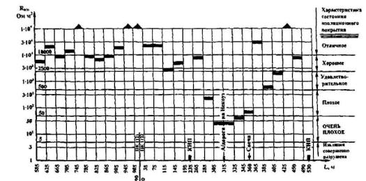 где к = 1·106 - эмпирический коэффициент пропорциональности Ом2·м2·мм2; Rи - сопротивление изоляционного покрытия на площади одного квадратного метра, Ом·м2. Изоляционное покрытие на этом интервале характеризуется как ПЛОХОЕ и имеет сквозные дефекты в покрытии площадью