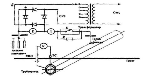 На измеренных интервалах и только на тех интервалах, где величины сопротивлений изоляционного покрытия менее 500 Ом·м2, обязательно измеряются поляризационные потенциалы для оценки катодной защищенности металла трубопровода от почвенной коррозии. Для этого используется один из известных методов измерений поляризационных потенциалов: метод синхронного отключения нескольких источников поляризации, широко применяемый как в России, так и в странах Запада под названием "интенсивная технология" [6, 13]; один из экстраполяционных методов [14]; метод компенсации [15] или метод вспомогательного электрода [14].
