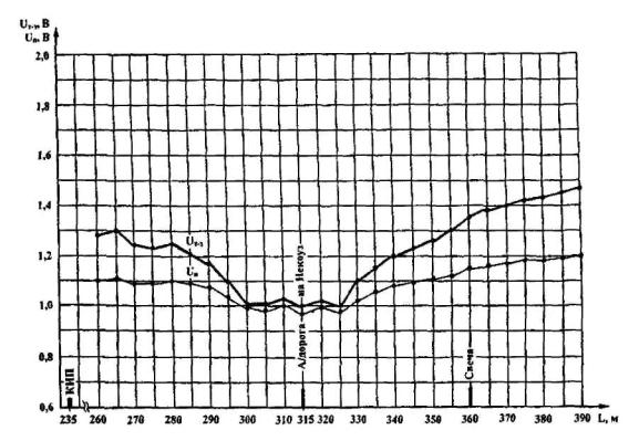 Рис.3.24 Графики измеренных поперечных градиентов потенциалов на расстоянии 10 м при включенном токе поляризации (dUт-з) и при отключенном токе поляризации (dUп) с использованием "интенсивной технологии" на газопроводе Ухта-Торжок D = 1420 мм с полиэтиленовой изоляцией, эксплуатирующемся с 1978 г. 6. Для песчаных грунтов, имеющих величину удельного электрического сопротивления ρ > 1000 Ом·м, поляризационный потенциал должен быть Uп ≤ -650 мВ. 7. Для песчаных грунтов, имеющих величину удельного электрического сопротивления от ρ = 500 Ом·м до ρ = 1000 Ом·м, поляризационный потенциал должен быть Uп ≤ -750 мВ (или смешение потенциала от его стационарного значения должно быть более 100 мВ). 8. Для грунтов со средней степенью аэрации, имеющих величину удельного электрического сопротивления от ρ = 500 Ом·м и менее, поляризационный потенциал должен быть Uп ≤ -850 мВ и до Uп = -1100 мВ. 9. Для анаэробных грунтов (суглинки, глины, болота) поляризационный потенциал должен быть Uп ≤ -950 мВ и до Uп = -1150 мВ. 4 ЗАКЛЮЧЕНИЕДанная МЕТОДИКА является следствием многолетних исследований на трассах подземных трубопроводов, позволяющих сделать вывод, что в настоящее время без высокопроизводительного и эффективного контроля глубины заложения, положения трубопровода, состояния изоляционного покрытия и оценки катодной защищенности невозможно развитие современной технологии эксплуатации протяженных подземных трубопроводов. Настоящая методика позволяет определять положение трубопровода под землей, его кривизну, измерять глубину его заложения, производить контроль состояния всех типов изоляционных покрытий трубопроводов любого диаметра как контактным, так и бесконтактным методами, измерять поляризационные потенциалы различными методами и некоторые другие электрические параметры подземного трубопровода. Приведены необходимые расчетные формулы и номограммы (или таблицы) для определения интегральных величин сопротивления изоляционного покрытия. Рассмотрена оптимальная технология и последовательность производства измерений в полевых условиях по нахождению мест сквозных повреждений изоляционного покрытия. Приведены технологичные методы обследования трубопроводов и схемы измерений поляризационных потенциалов в полевых условиях. Показана возможность применения отечественной и зарубежной аппаратуры при использовании данной методики. Методика позволяет определять состояние изоляционного покрытия, интегральную величину его сопротивления, интегральную величину площади дефектов, скорость старения изоляционного покрытия, остаточный ресурс изоляционного покрытия, сквозные повреждения в изоляционном покрытии с помощью, контактных и бесконтактных методов путем измерения составляющей электромагнитного поля, создаваемого переменным током, протекающим по трубопроводу от генератора звуковой частоты, позволяет оценивать защищенность металла трубы катодной защитой по величине поляризационных потенциалов. Разработанная методика обладает новизной и представляет практический интерес для работников газовой, нефтяной и коммунальной отраслей. Литература1. ГОСТ Р 51164-98. Трубопроводы стальные магистральные. Общие требования к защите от коррозии. М.: ПИК Изд-во стандартов, 1998. 2. Инструкция по интегральной оценке состояния изоляционного покрытия законченных строительс