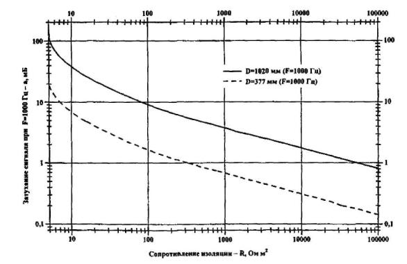 Номограмма определения сопротивления изоляции по затуханию сигнала с частотой F = 1000 Гц для DT =377 мм и DT =1020 мм