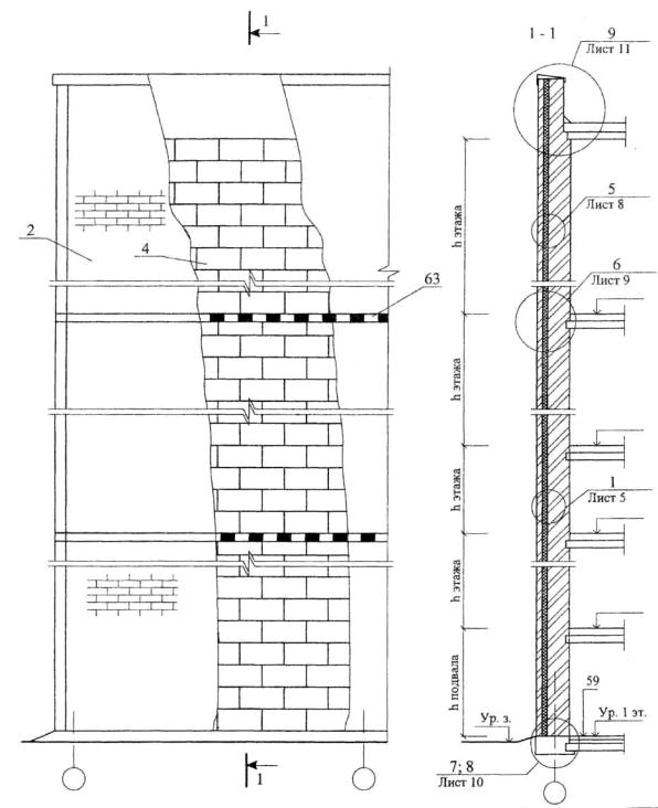 М24.40/05 - 3.1 Реконструкция Схема 9 - 10 Узел 16 - 26 СХЕМА № 9. Расположение теплоизоляции защитно-декоративной кладки