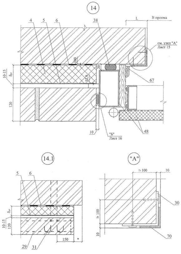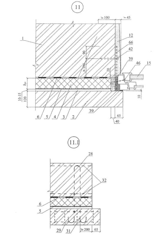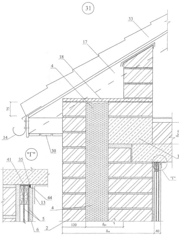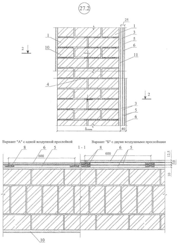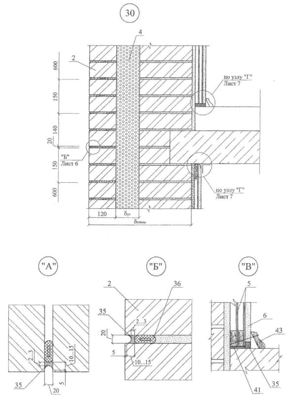 КОНСТРУКТИВНЫЕ РЕШЕНИЯ СТЕН 4. СТЕНЫ МНОГОСЛОЙНЫЕ С МИНЕРАЛОВАТНОЙ ТЕПЛОИЗОЛЯЦИЕЙ С НАКЛЕЕННЫМ СЛОЕМ ПЕНОФОЛА ИЛИ АРМОФОЛА4.1. Стена при новом строительстве может быть несущей или самонесущей и представляет собой трехслойную конструкцию с несущим слоем из полнотелого керамического кирпича толщиной 380 мм (со слоем внутренней штукатурки 20 мм для помещений 1 и 2 группы и без штукатурки - для третьей группы), слоем теплоизоляции из минераловатных плит, на поверхность которых, обращенную в сторону замкнутой воздушной прослойки, наклеен слой Пенофола (ТУ 2244-056-04696843-2001) или Армофола (ТУ 1811-064-04696843-99) и защитно-декоративным наружным слоем из кирпича толщиной 120 мм. Для защитной стенки может применяться кирпич или камни керамические лицевые (ГОСТ 7484-78) или отборные стандартные (ГОСТ 530-95) предпочтительно полусухого прессования, а также силикатный кирпич (ГОСТ 379-95). При облицовке силикатным кирпичом цоколь, пояса, парапеты и карниз выполняют из керамического кирпича. При новом строительстве защитная стенка из кирпича может выполняться на всю высоту здания. При этом она может быть самонесущей до высоты 6...7 м, а далее навесной с опиранием на пояса выступающие из несущей стены через каждые 2 этажа (6...7 м) по высоте здания. При реконструкции кирпичная защитная стенка обязательна в виде цоколя высотой не менее 2,5 м от планировочной отметки. По архитектурным соображениям она может быть выполнена самонесущей и большей высоты. 4.2. При защитной стенке из кирпича кладка ведется с обязательным заполнением раствором горизонтальных и вертикальных швов и расшивкой с фасадной стороны. Зазор между теплоизоляцией и защитной стенкой может составлять 10 - 15 мм. Шаг температурных швов в кирпичной облицовке принимается по СНиП II-22-81* как для неотапливаемых зданий. 4.3. В качестве отражающего экрана, наклеенного на слой минераловатной теплоизоляции, следует использовать перфорированные Пенофол или Пенофол 2000 тип "С" толщиной 10 или 3 мм, а также Армофол тип "С", номенклатура которых приведена в таблице 3, а физико-технические характеристики в таблице 4. Номенклатура отражающей изоляции Таблица 3