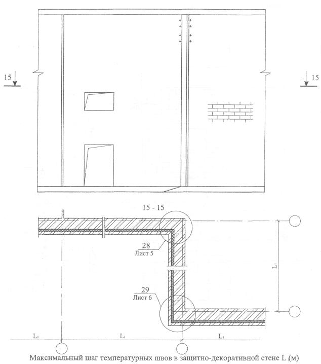 Максимальный шаг температурных швов в защитно-декоративной стене L1 см в таблице № 1 на листе докум. М24.40/05 СХЕМА № 7